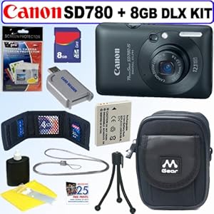 It may be the slimmest Digital ELPH Canon has ever created, but the impact couldn't be bigger. The PowerShot SD780 IS Digital ELPH captivates the senses with bold saturated colors and a daringly original design that matches the intensity of Canon's most innovative camera technology. Plus, you've got an advanced DIGIC 4 Image Processor with evolved Face Detection Technology and the Face Detection Self-timer for extraordinary control and performance. This technology finds and tracks the faces of moving subjects until you're ready to shoot, then delivers perfect focus. In addition, exposure, flash and white balance are compensated, so that faces exhibit natural skin tones and backgrounds are properly exposed. The camera also makes it easy to enjoy HD movies (and still photos) in beautiful high definition (1280 x 720 pixels) on your HDTV with a mini-HDMI connector for direct connection to a high-definition monitor. You'll enjoy the HD experience with no degradation of image or audio in the signal, plus the ability to display up to 130 still images at once. So the shots you used to miss are the images you'll now be sharing, and the movies you never took before will be HD unforgettable. Focal Length - 5.9-17.9mm f/3.2-5.8 (35mm film equivalent - 33-100mm) LCD Monitor - 2.5-inch TFT color LCD widescreen with wide viewing angle, Approx. 230,000 pixels ISO Sensitivity - Auto, ISO 80/100/200/400/800/1600 equivalent Continuous Shooting - Approx. 0.8 fps Compression Mode - Still Image - Exif 2.2 (JPEG); Movie - MOV (H.264) Card Number of Recording Pixels - Still Image - up to 4000 x 3000 (Large); Movie - High Definition - up to 1280 x 720 (30 fps) Video Output - NTSC/PAL Dimensions - 3.43 (W) x 2.15 (H) x 0.72 (D).8GB Accessory Kit: 8 Gigabyte SD Memory Card - Memory Card Wallet - Compact Camera Carrying Case with Pocket and Strap - Lens Care & Cleaning Kit - Pack of LCD Screen Protectors - Flexible Legged Mini Table Tripod - BONUS!! FREE 25 Quality Prints.